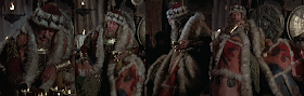 The snake glyph pattern lining also appears on the robe worn by the priest that witnesses Thulsa's demise, as well as on the Phrygian-esque headdresses worn by the lesser cult members; the lesser members wear more simplistic robes and orange sashes compared to the priests. Ron Cobb designed the armor worn by Thulsa's soldiers, again heavily reinforcing the Mongolian inspiration, though the armor plates also resemble scales, emphasizing the reptile motif of Thulsa's cult. The armor is worn over a white tunic and pantaloons.Several extras playing Thulsa's servants also sport black quilted tabards with fur lining, as seen in the second image; these are actually reused costumes that Bloomfield had designed (and had constructed at Bermans & Nathans, most likely) previously for the godawful Peter Sellers swansong The Fiendish Plot of Dr Fu Manchu.