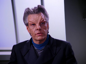 This episode involved the android Data being captured by a sleazy and duplicitous toy collector, Kivas Fajo (Saul Rubinek), who throughout the entire episode sports a rather lovely plum coloured outfit, the top covered in a curved pattern of a lighter colour, and the leggings shaped like riding breeches. Kivas Fajo also wears a little badge on his chest, and a gold-lined purple skullcap as well. It should be worth noting that Fajo originally had a very different appearance, costume included - he was originally played by David Rappaport (perhaps most famous for his role in Terry Gilliam's Time Bandits), who in his scenes sported two slightly different asymmetrical patterned jumpsuits, both of them consisting of the colours blue, purple, red and blue. The circumstances behind Rappaport's replacement by Rubinek is definitely upsetting. Rappaport was suffering from severe, suicidal depression at the time of filming, and was replaced when after two days of filming, he attempted to kill himself - tragically, this was a month before he finally did take his own life. It is interesting that the extra's costumes were designed with the same sense as Rappaport's Kivas Fajo, as they all consist of similar jumpsuits with the legs fashioned like breeches, and the tops being two-tone diagonal colour schemes, such as the unlucky Varria's (Jane Daly) purple and blue jumpsuit. Data himself is made to wear a slightly similar costume, this one being of a lilac top and grey bottom and cuffs. Kivas Fajo's other workers are in similar jumpsuits of grey and green colourschemes. Kivas Fajo tries to show his collection off to another wealthy (and very ugly!) alien, Toff (Nehemiah Persoff), who wears a shiny gold-green robe with golden bracelets and also some golden thing stuck in what I assume is his nose - ugh! It seems according to costume auction photos, this was originally meant to have a large bow on the front of the waist - though I think here it was actually worn at the back.'Sarek'
