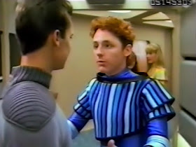 This episode involved the Enterprise crew being embroiled in the political struggles of the planet Rutia IV, which was in the grip of terrorists. One of these terrorists is the waiter Katik Shaw (Marc Buckland), who wears a silver lined burgundy jacket over a pink and blue jumper. The security forces of Rutia IV are all in rather crisp blue uniforms, with a dark blue diagonal panel adorning one shoulder, and cuffs made of the same material, with the dark blue always having a silvery lining - usually I don't care for uniform designs, but this one is so nicely designed and futuristic that it totally warrants a place here!'Deja Q'