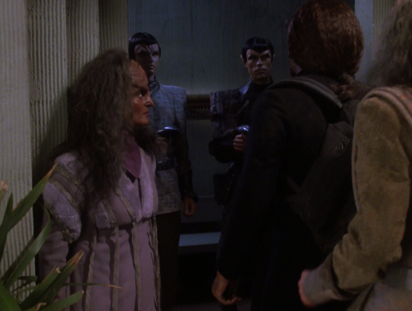 This episode once again involved the Cardassians, who are now in a redesigned uniform that they would keep wearing for the remainder of their appearances, especially in the sequel show Deep Space 9. The new uniform is thoroughly different to the one they sported in their unitial appearance in the fourth season, consisting of bulky matte black armor worn over a black jumpsuits. The armor is curved and points downward to the wasit, and is designed to have a collar line that extends into a sort of crest at the front of the chest. This uniform is worn with large boots as well. This design slightly keeps in with the 'Ancient Egypt' theme that the Cardassians were originally designed in mind of. These screenshots are mostly not from this episode, instead being from the Cardassians appearances in the following and final season of The Next Generation. This design sense is even kept with their children, as the Cardassian torturer Madred (David Warner)'s daughter wears a grey velvet dress with a triangular panelling over the chest and shoulders.'Aquiel'