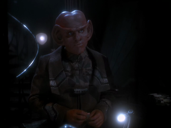 This episode featured Quark trying to make a deal with the unlucky alien trader Ashrock (Don Stark), who wears a tailcoat with red and brown leather-like material, fastened with a large golden buckle Quark has also involved himself with the even less trustworthy Fallit Kot (Peter Crombie) who wears a brown patterned wraparound jacket with a stiff cut to its tail end, with short sleeves. Also seen in this episode is a Klingon chef who wears this large wraparound jacket with an angular collar, and a large white band across the waist section as well.'Rules of Acquisition'
