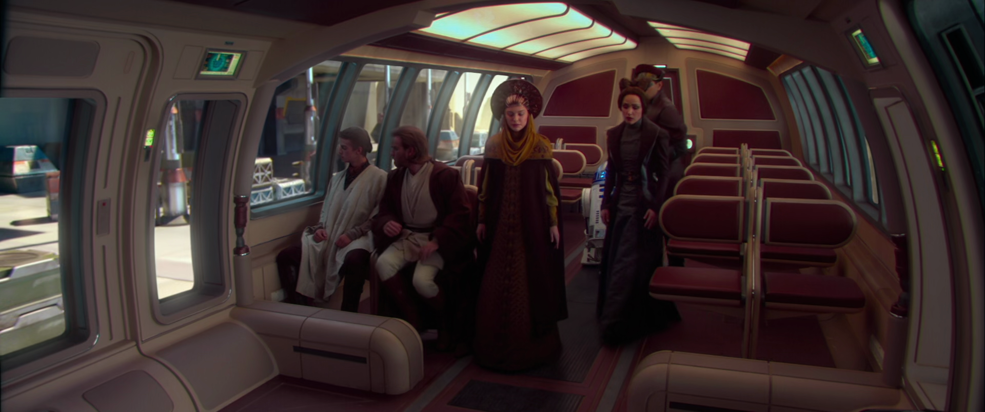 The second part of the prequel trilogy, Attack of the Clones, which once again had Trisha Biggar realizing lavish costumes (based on the various costume sketches by Iain McCaig and others) to be worn during some hilariously badly-written romance scenes. Padme's first costume is a purple lined dress of a floral print, with a large sleeves and speckled jewel pieces over the back of the collar, and her hair being bunched up in a conical hairstyle. A lot of the dresses worn in the prequels tend to consist of diagonal pieces of fabric, wthis being being no exception judging by the underskirt part of the dress. Padme's second dress, worn after a videogame cutscene sequence, is a grey and black dress with large puffy sleeves and a patterned piece worn over the front. Also completing the look is a sort of headdress consisting of triangular metallic pieces worn over a 'bun' hairdo that was possibly meant to call back the hairdo worn by the princess Leia (Carrie Fisher) in the original films. There was however a very elaborate dress worn by Padme that was never seen in the final film due to the sequence being deleted - in a senate hearing, Padme wears this large-sleeved dark blue and yellow dress, with filigree-like markings over the shoulders. One of Padme's most striking outfits in the film is worn when she goes in disguise, leaving the planet Coruscant for her home planet of Naboo. This dress, according to Biggar, was inspired by Russian traditional gowns, with this being most obvious in the disc-shaped headress and long flowing shape of the dress, which is made of an orange and burgunday fabric no less. According to Biggar, a lot of the costumes in the prequels, including this one, were made with fabrics native to her home city of Glasgow in Scotland too! This dress is slightly tweaked when onboard the passenger ship, with the headdress dovered with a lace veil, and the the burgundy part of the dress removed. Also of note is the disguise worn by Anakin (Hayden Christansen), which is a lovely patterned black and gold shirt. When back to her family home on Naboo, Padme wears a lovely flowing dress made of a pastel pink and cream fabric, with curved metallic pieces around the neck. Shame this is the dress worn during the infamous 'I hate sand' scene. Another lovely dress worn during a romance scene is this floral-patterned deal, adorned with translucent fabrics and a hairdo that has also been fitted to resemble the 'Danish buns' hairstyle Carrie Fisher sported as Leia in the original Star Wars. There was another dress worn by Padme that didnt make it into the final film due to its scene being cut, this being when Padme visits her family on Naboo - this is a bit of a more skimpy dress, consisting of a powder blue top and skirt that exposes the midriff. Outdoors this dress is worn with a pale cloak as well. Perhaps one of the most risque costumes in the prequel films (not worn by a background character, that is), this latex leather corset dress is worn with a glittery scarf, as well as briefly with a feathered collar. In perhaps one of the film's mosr unpleasantly maudlin (and hilariously badly written) sequences, Anakin has nightmares about his mum getting murdered and returns to Tatooine, Padme travelling with him wearing a silvery patterned hooded cloak, fastened with a brooch. Underneath the cloak is a another dress, this being a large sleeved blueish-white deal that has been cut to expose the midriff, and once again, to call back the original films, Padme's hair is arranged in a buns hairstyle. During the most hilariously awful sequence of the film where Anakin spouts off like a whiny teenager about having massacred unarmed kids, Padme sports a blue dress which has a more stiff fabric piece over it, this more a stiff segment adorned with yellow, orange and and red patterns, as well as trailing threads hanging down from it as well. For the rest of the film, Padme wears a form-fitting white jumpsuit, with lining around the collar, and worn with a beige cloak and boots - this design looks like it was attemping to call back the unused design sketches of Ralph McQuarrie that were left on the drawing room floor, as well as the white colour of Leia's costumes in Star Wars and The Empire Strikes Back. Somehow Anakin and Padme get together at the end of the film and foor the wedding, Padme wears a wedding gown made of lace, which according to Biggar was found on an old bedsheet in Australia! Naturally, in this film Padme once again has several servants around her, with the first we see being another 'decoy, though this unlucky one gets offed in an explosion. The outfit, briefly seen in the film itself, is a white gown adorned with black fabric the sides, as well as a black necklace worn around the neck and a hairdo akin to those sported by Queen Amidala in The Phantom Menace. Padme is always assisted by her faithful handmaiden Dorme (Rose Byrne), who in her first appearance wears a hooded purple gown, though the hood is down in all her scenes. Dorme's second outfit is a more formal blueish-grey dress, with circular lining around the sides, and designed to slightly resemble a late era Victorian dress if anything. There seems to be another dress that Dorme wore that seems to have not made it into the final film, made of darker materials. On Naboo is the current queen, Jamillia (Ayesha Dharker), who sports a regal gown of a black and white colourscheme, with the design being a bit similar to the red robe worn by Amidala in the previous film. Here, the look is slighty different due to Jamillia's makeup, and ridged fan-like headdress, as well as shiny black material going down the dress in a diagonal shape. Also of note in this sequence is the one Naboo politician in the metallic green-blue dress designed to have a large feathery collar, as well as Sio Bibble (yep, I still hate typing up that name) returning in a rather drab tunic made out of a rough material. You can also see Jamillia's handmaidens, whose 