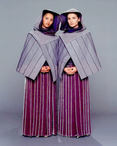 The last of the infamous prequel trilogy, Revenge of the Sith is my least favorite by far for many reasons. The one consistently decent thing in the film amidst the maudlin writing and messy visuals is the costume design, though the bulk of it is again worn by extras you barely see on-screen or in deleted scenes. Padme (Natalie Portman), now the secret wife of Anakin Skywalker (Hayden Christensen), still gets to sport a few lovely outfits. Her first notable outfit is worn in a scene between her and Anakin, this outfit consisting of dark plum robe with floral patterns around the shoulders, worn with a similarly coloured headdress. The second of Padme's notable outfits is worn in some political drama scene, and again consists of a dark blue-purple coloured robe with large shoulders and a ruff colour, adorned with almond shaped brooches and worn with a halo-shaped metallic headdress. Again, a lovely costume barely seen in its film, obscured by videogamey CGI spectacle. Padme's third notable outfit is worn when Obi-Wan Kenobi (Ewan McGregor) breaks to her the news that Anakin has committed infanticide...oh sorry, I mean, 'killed younglings'. This is a more simply gown, of a deep purple fabric with a patterned strip running down the sides of the sleeves. One outfit that did not make it into the final film was this rather severe and muted deal worn with a dreadlocked hairstyle, worn during a scene in which Padme and other senators confront Palpatine - in publicity photos, this outfit is blue and grey in colour, but for some reason my screenshots of the deleted scene make it look like a muted brown. One of Padme's most striking costumes from the film is worn when her character is dead, and is shown briefly to be wearing a lovely sparkling sea-blue cloak and dress, the cloak coated in glittery pieces as well. This dress is, again, sadly barely seen in the actual film, but can be seen via the various behind the scenes photos online. Padme's funeral lets us see a few other Naboo denizens, with the most notable being the the current Naboo queen, Apailana (Keisha Castle-Hughes) in a shinier version of the kimono or hanfu inspired regal garb that was worn by Queen Amidala back in The Phantom Menace. As for the other Naboo citizens, we don't really see their outfits in full sadly, the most striking being Padme's father Ruwee Naberrie (Graeme Blundell), who together with his wife had more scenes in deleted sequences in Attack of the Clones Also included are the various handmaidens robes, that are not really seen in the final film, mostly due to being either in the background or in deleted scenes. The Republic's Chancellor Palpatine (Ian McDiarmid) finally is revealed to be evil in this film, though doesn't wear too many new outfits. He is first seen in a robe made of some rather rough, grey material (that I'm honestly not much a fan of), with a large panel going down the front, as well as large sleeves. In scenes that were deleted from the final cut of the film, Palpatine would have wore a large-shouldered black robe worn over a sort of golden material, the shoulders having curve embroidery all over them as well - quite a shame this outfit didn't get more screentime in the film, honestly! Palpatine's second main on-screen outfit is a more subdued version of his large sleeved outfit worn in Attack of the Clones, with the shoulders now much less pronounced and more streamlined, though the basic shape of the rest of the outfit is similar. Bail Organa (Jimmy Smitts) has more of a role in this film, though most of his costumes tend to be of a muted grey colour scheme, such as this costume he wears during the massacre of the Jedi, which is a grey shirt and trousers with a large black leather top worn over the shirt. For most of the film, Organa wears a grey jumpsuit with metallic cuffs and a large sweeping grey cloak, that goes down one side of in a sloping direction. The last notable outfit Organa wears is worn in a boring Senate sequence, which is a grey tunic worn with a large blue cloak, that is fastened with a metallic piece that goes over the shoulders. Organa's wife is briefly seen at the end of the film on his home planet of Alderaan, so once again an ornate outfit was made just to not be seen in the film at all - this robe is mostly muted colour wise, but has sleeves cut in ridges in a similar manner to some of the Trade Federation robes seen in The Phantom Menace. There are a few other Alderaan natives seen on Organa's spaceship, with one woman in a white dress and cloak, as well as crewyman in grey jumpsuits that have large lined chestboards going over the front and back, briefly also seen with capes as well. Once again, most of the costumes designed for the film were barely seen on screen, with one example being Palpatine's silent assistant Sly Moore, who wears a feather grey cloak fixed with a large collar, making the character look vaguely like some sort of riff on the Snow Queen. Palpatine's other assistant, Mas Amedda, also appears in this film is a grey gown that is worn with a mustard coloured cape, the cape fixed with large curved shoulder pads, as well as a red sash. Like the other prequel films, there was a ton of effort put into costuming background extras for the senate and opera house sequences, as well as several politician characters who were in scenes deleted out of the film's final cut - one of these being a younger version of Mon Mothma, the Rebel leader in Return of the Jedi. I do quite like a lot of these costumes, but I had to go through so much searching to find even decent copies of the images, as well as having to find scanned copies of the various 'visual dictionary' tie-in books made for them... The Separatists also appear here, though once again are barely seen properly, obscured by tons of CGI rubbish. The Trade Federation head Nute Gunray makes his final appearance here, in an orange and red gown with large shoulders and a detailed leather panel going down the front, a