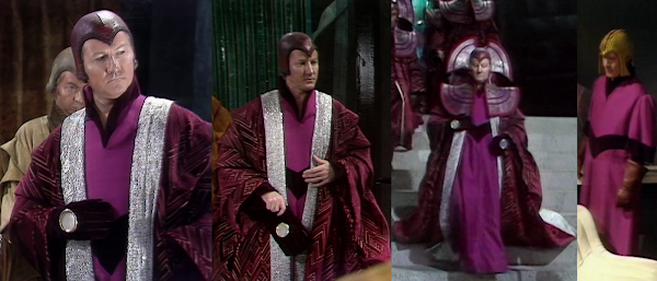 Costume Reuse note: Many of the Time Lord costumes in this serial would be reused in later serials set on Gallifrey. Pravda's brown and gold robe would be worn again by 'Castellans' in 'The Invasion of Time', 'Arc of Infinity' and 'The Five Doctors'.(Also, I do not know if Tom Baker's costume in this serial, consisting of a buccaneer shirt and trousers, was actually custom-made or just wardrobe stock. As of now, I will assume the latter.)
